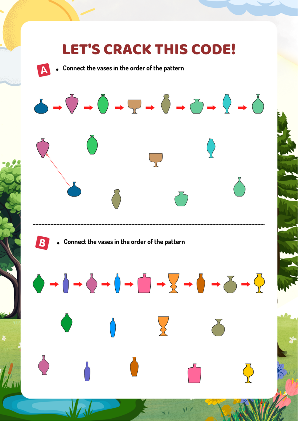 - Activities like shape matching, mini mazes, pattern games, and secret code puzzles